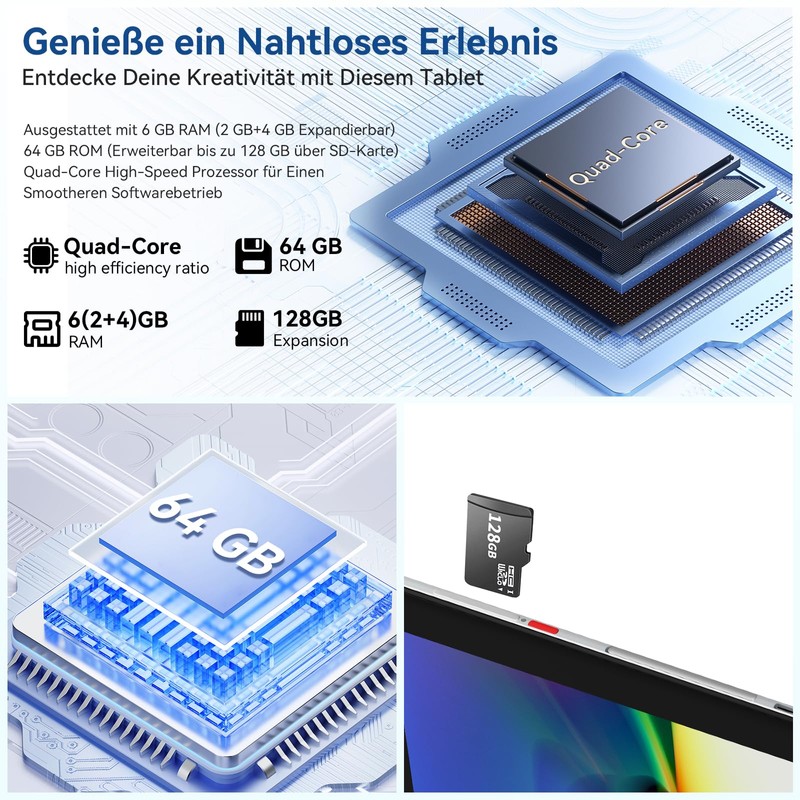 A perfect balance of performance, mobility and multimedia experience: this 10.1-inch tablet with Android system combines a powerful quad-core processor with a slim design to seamlessly support your everyday activities. Whether for work, lessons or leisure – with its high-quality components such as 6GB RAM, 64GB internal memory (expandable to 128GB via microSD) and 5000mAh durability. It stands it is every challchallgrown.