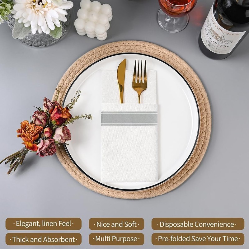 - These Disposable Dinner Napkin has the look and feel of linen - premium quality dinner napkins feel very similar to a soft linen dinner napkin, elegant and disposable, very convenient.