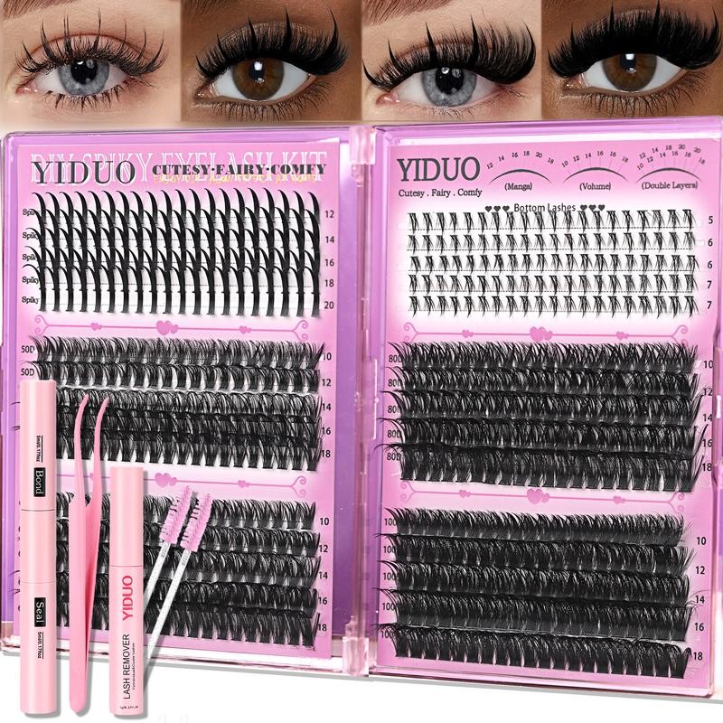 YIDUO Black Eyelash Extension Kit 50D 60D 80D 100D & Spikes Eyelash Clusters Family & Eyelash Clusters Family 600Pcs Personal Eyelash Extension Kit 5-18mm C D-Curl Individual Lash with Lash Bond and Seal, Lash Remover, and Eyelash Tweezers