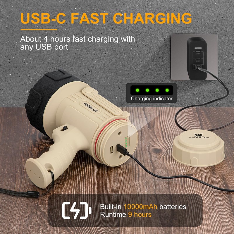 - LONG TIME LIGHTING & POWER BANK: Built-in 10000 mAh batteries, YIERBLUE’s proprietary battery technology give you up to 9 hours lighting on lower settings, 3 hours lighting on higher settings. An output port built into the spot light can be used as a power bank to charge your devices in emergency.