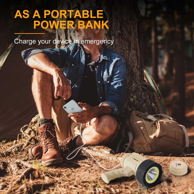 - WATERPROOF & FLOATING, IMPACT RESISTANT: This spot lights outdoor handheld is IP67 waterproof and submersible up to 3ft, and even float back up to the surface if it’s dropped in water. The High strength ABS housing with silicone protective case ensures maximum durability, rugged body withstands dropping from up to 10ft.