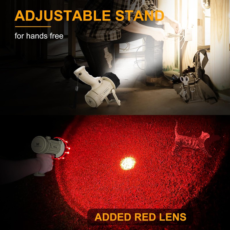 - MORE FUNCTION: Adjustable stand for hands-free lighting, the floodlight can be used alone as a work light; and removable red filter for hunting lighting. This spotlight floodlight is a perfect lighting tool for working, camping, boating, hunting etc.