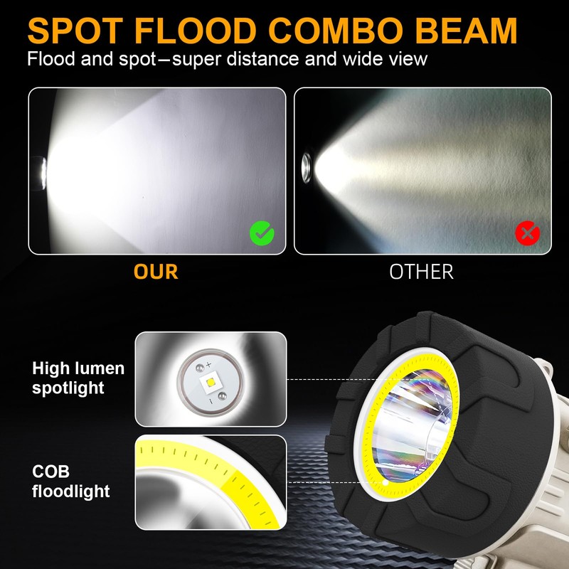 - SPOT FLOOD COMBO LIGHT: This extra bright LED spotlight + COB Floodlight casts a 1000,000 high lumen beam out to an incredible 550 yards and a wide view. The COB floodlight compensates for the narrow beam of the spotlight, can be used alone as a work light. LEDs boast an extended 50000-hour lifespan. Features 6 adaptable settings: Spot+Flood / Spot High / Spot Low / Flood High / Flood Low / SOS(Long press 3 seconds).