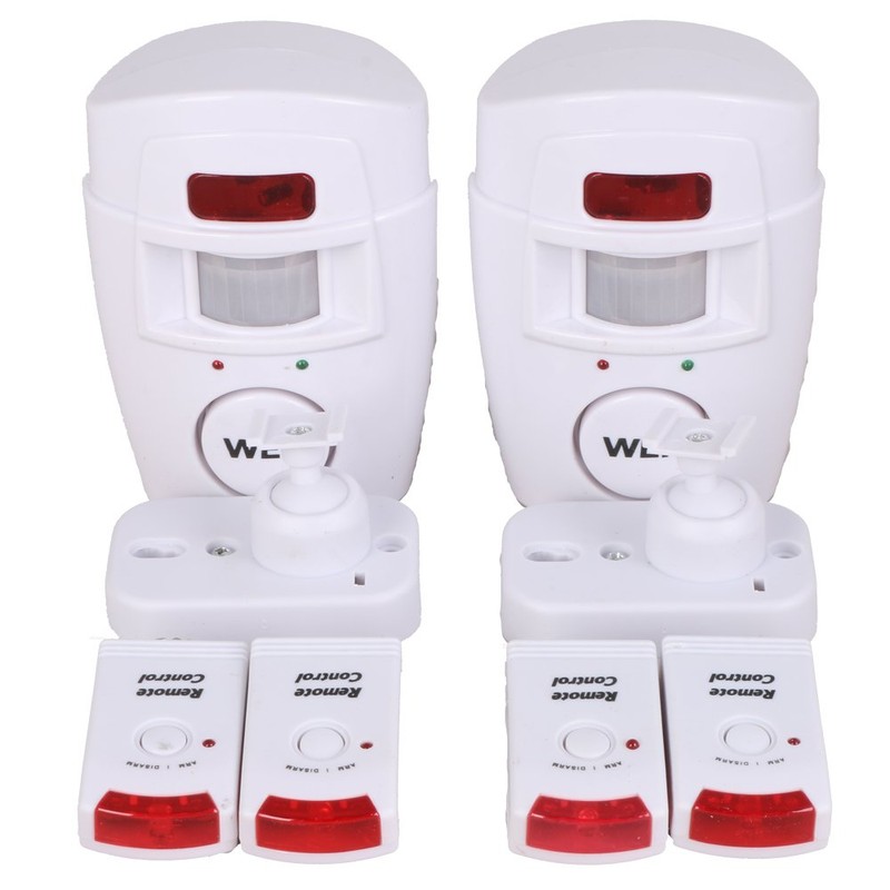- Set Includes: Alarm x 2, bracket wall (adjustable) x 2, dedicated remote control (ON/OFF control) x 4