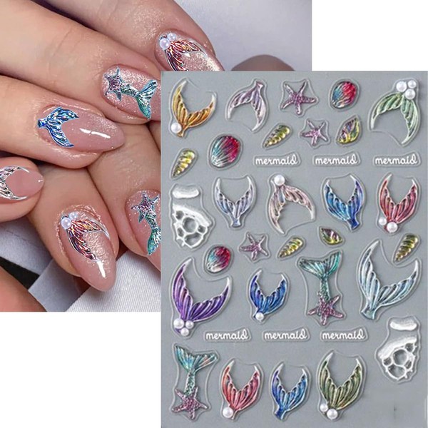 YIHONGYAN Summer Nail Stickers Cute Decoration 5D Relief Iridescent Mermaid Tail Stickers Design Stick on Nails for Women Girls Nail Art Supplies 1 Sheets