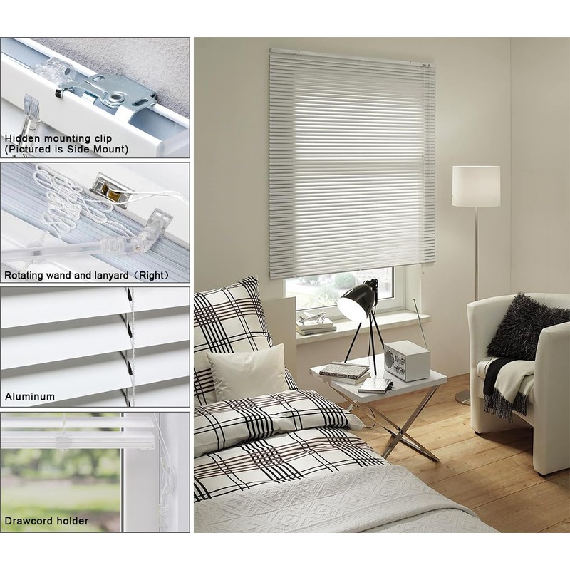 - Features and Functions:The white blinds are equipped with Safety Clip, which can provide child safety and prevent messy ropes.The 1" aluminum plate is specially treated so you don't have to worry about hurting yourself. The 1.6lb weight makes it easy for one person to install.The weight of the lower rail keeps the blinds from shaking when the wind blows into the room.Mounting brackets can be installed in multiple directions,can be installed inside or outside the window frame.