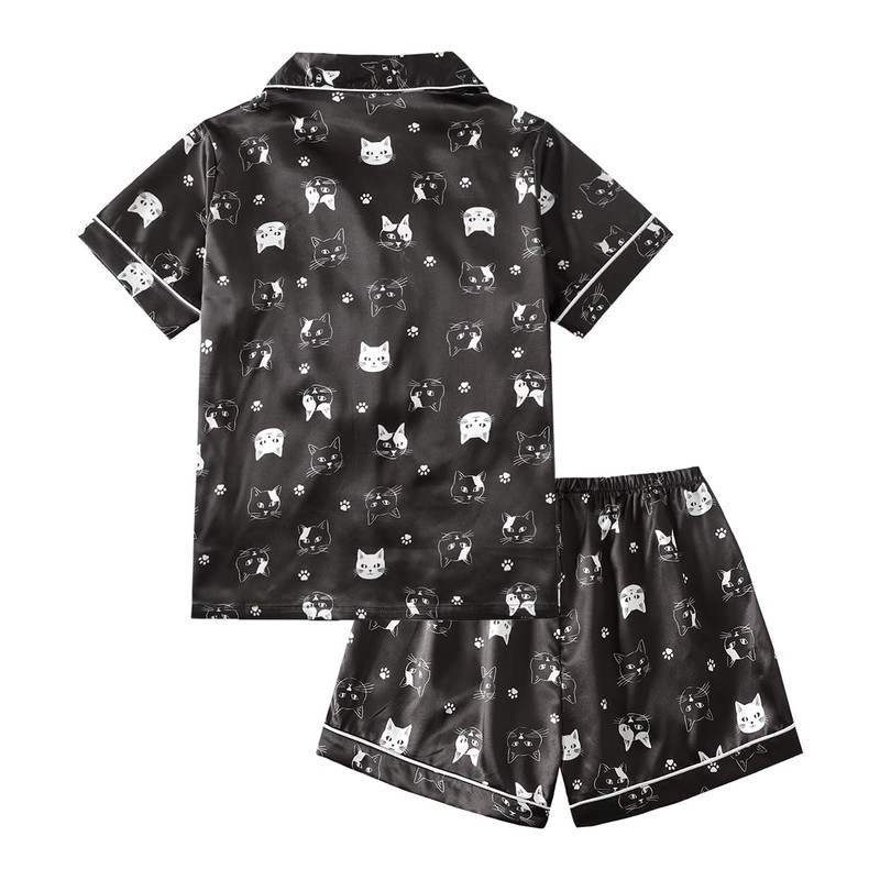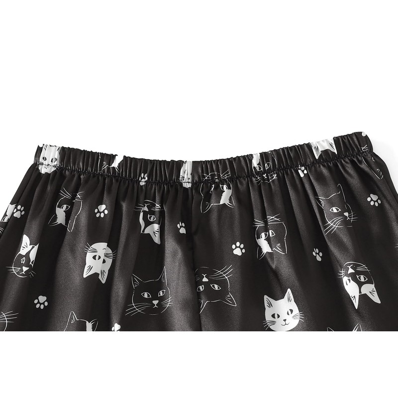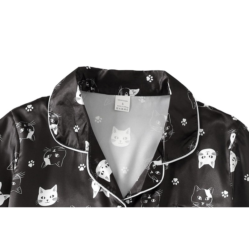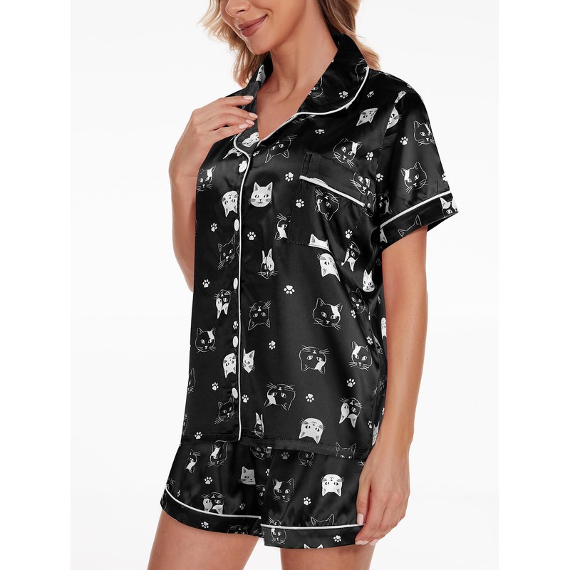 YIJIU Womens Silk Satin Pajama Sets Cute Print Short Sleeve Sleepwear Button Down Top and Shorts 2 Piece Pjs Lounge Set, Black Cat, X-Small