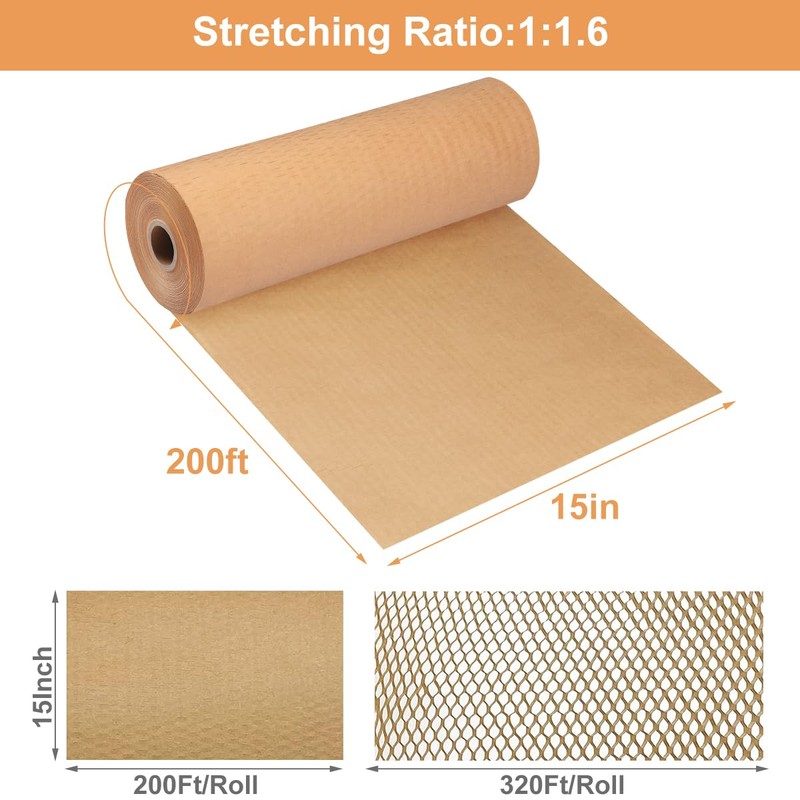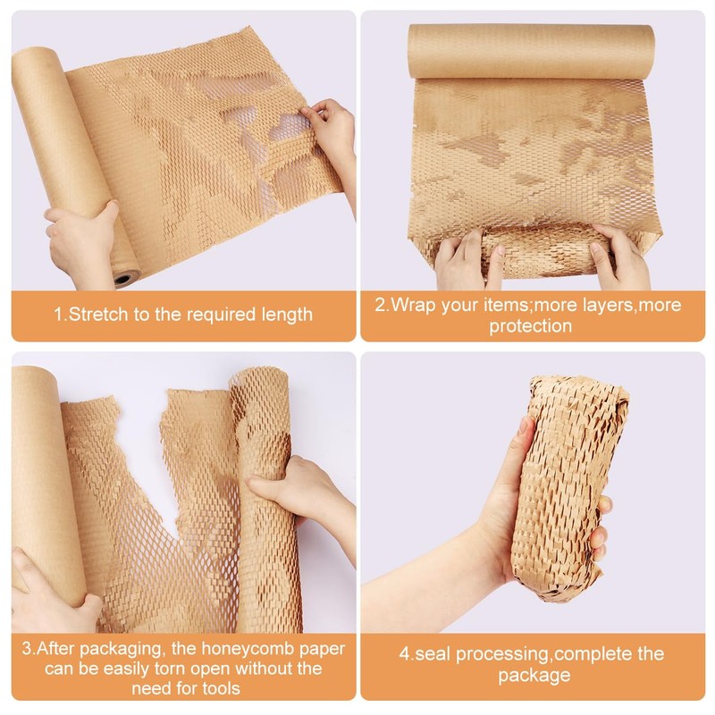 - Renewable packaging supplies: Environmentally friendly 100% biodegradable kraft paper, a green alternative to plastic packaging materials. After stretching, the honeycomb structure can increase cushion performance and effectively protect the items that need to be packaged.