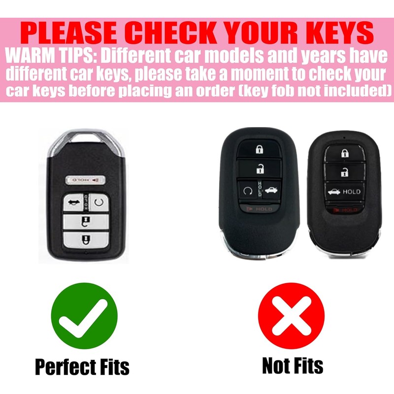 Fits Key Model: The key fob cover is compatible with Honda Civic, Accord, Pilot, CRV, HRV, CRZ ,Fit , Odyssey , Ridgeline ,JED ,Crosstour , Crider and Spirior 5 buttons smart key. The model is only for reference, please DOUBLE CHECK your key shape and button labels carefully to make sure it is the same as the second picture.(NOTE: same brand car may have different car key model.)