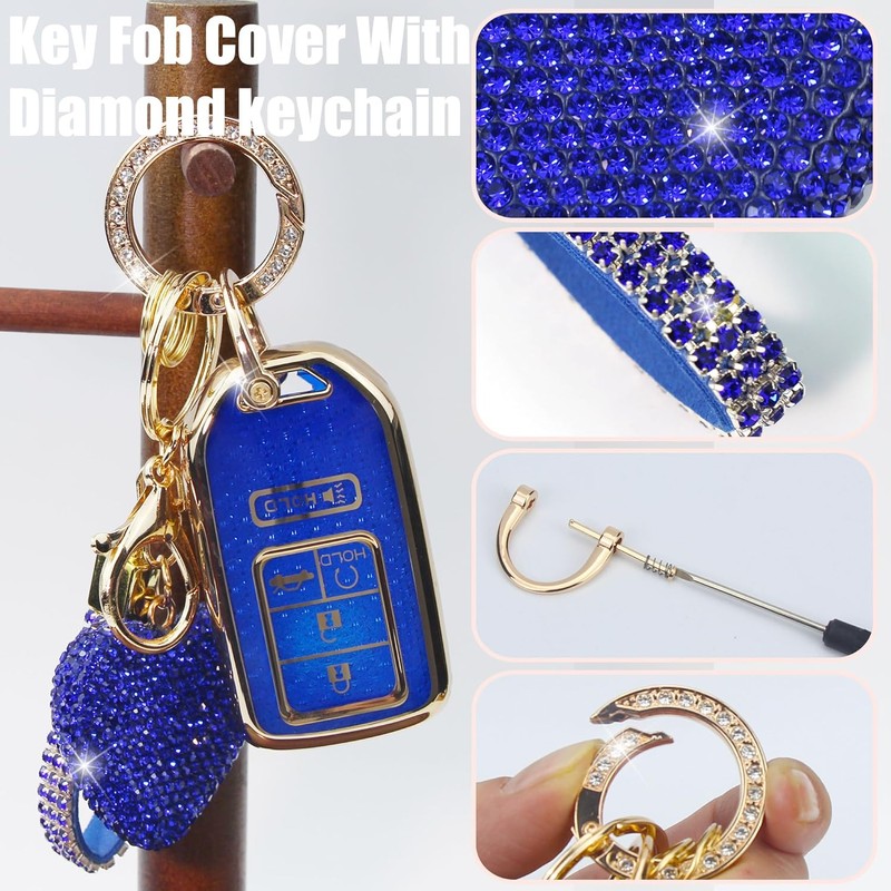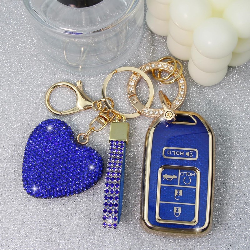YIKECASE Key Fob Cover with Diamond Keychain Car Key Holder Compatible with Honda Accord Civic CRV Pilot Ridgeline Passport (2016-2022) Smart Remote Key Protector for Women, 5 Buttons (Blue-Heart)