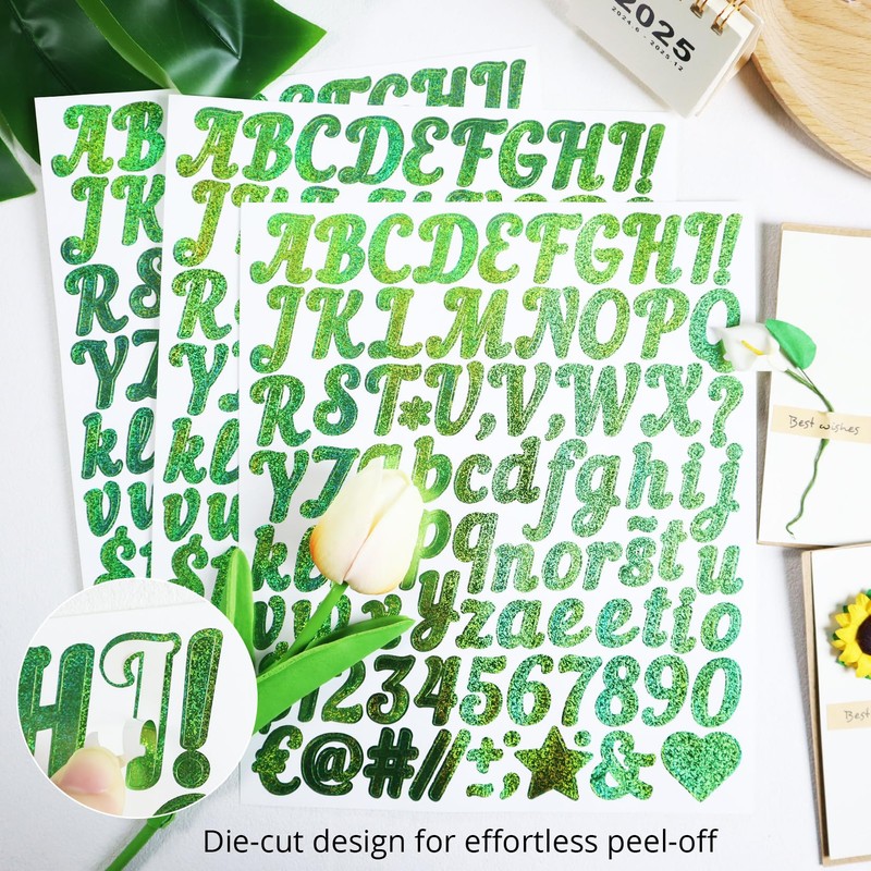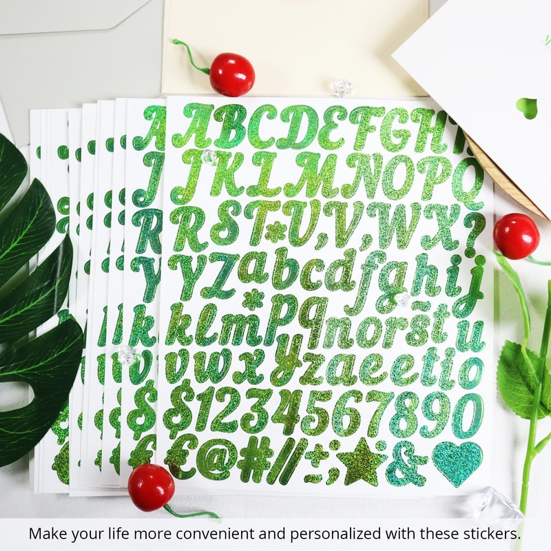 • Package:12 Sheets Glitter Green Letter and Number Stickers, Including Capital Letters and Lowercase Letters, Number and Symbolic Stickers.