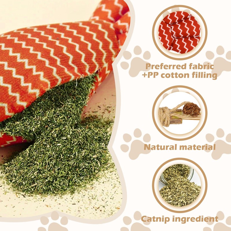 Package Contents: 3 Plush Catnip Fish, 3 Wood Catnip Sticks