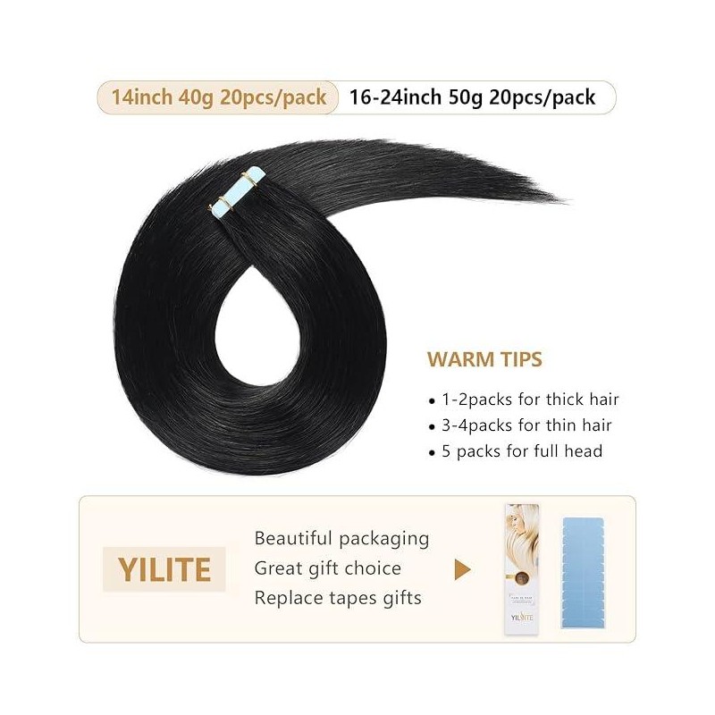 YILITE Tape in Hair Extensions Human Hair 20Pcs Skin Weft Remy Hair #1B Natural Black - Size: 22 Inch (Pack of 20)