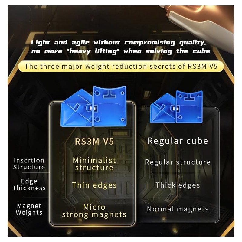 • LIGHTWEIGHT SPEED CUBE CHAMPION: Presenting the Moyu RS3M V5, the newest version in the renowned RS3M series, weighing a mere 71g! This lightweight design guarantees effortless rotations and unparalleled control, making the solving process a cinch. Join millions of cubers across the world and enhance your solving skills with the RS3M V5!