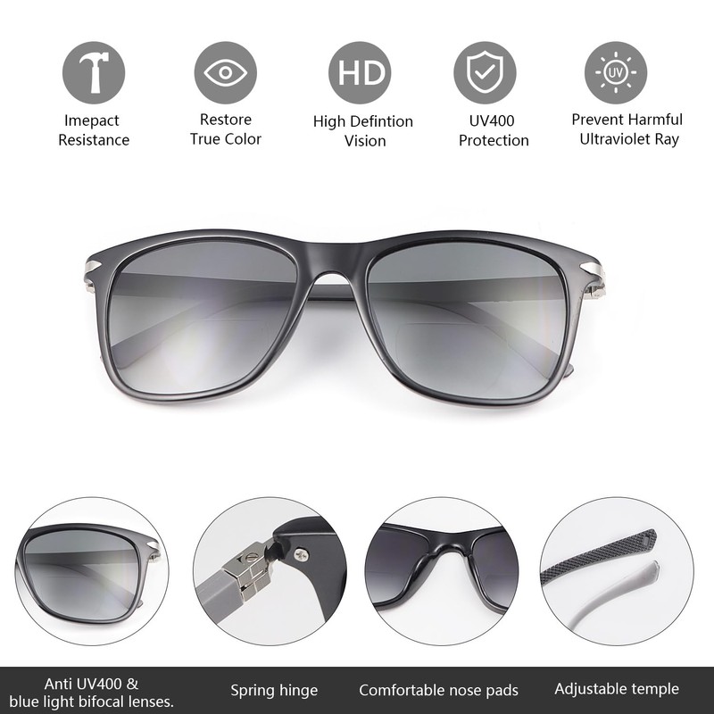 - Tinted Lenses --- Polarized lenses with UV400 protection block 100% of UVA and UVB rays. The light transmittance of the lens is very good. These lenses are essential for long-term eye protection while out and about. These bifocal readers reproduce true colors and eliminate reflections and stray light, giving you a clearer, softer view. Suitable for all climate and meteorological conditions.