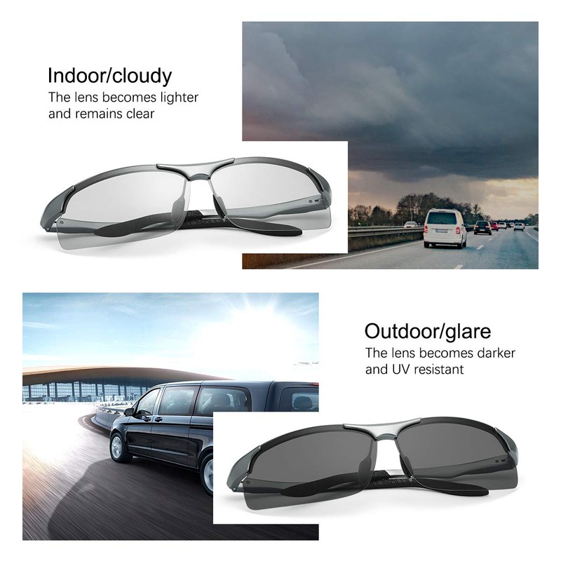 - 【Photochromic ‘black technology'】YIMI men' women' sunglasses adopt smart color-changing factor, the lens can feel the change of light and make the color change. In sunny outdoor, the color becomes darker, and at night and indoors, the color will change shallow. Transparent lens, high light transmittance, uniform discoloration, high-definition vision.