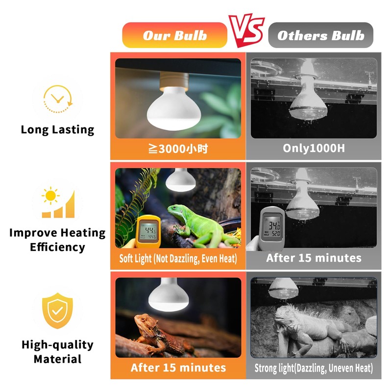 - ✔ Energy-Efficient Reptile Light Bulb: Yimidool reptile heat bulb with high-density glass increases heat efficiency by 30%. Upgrade to 2000-3000-hour lifespan (3-5x longer than standard reptile lamp) and 30% energy savings vs infrared lamps, ideal for 24/7 operation.