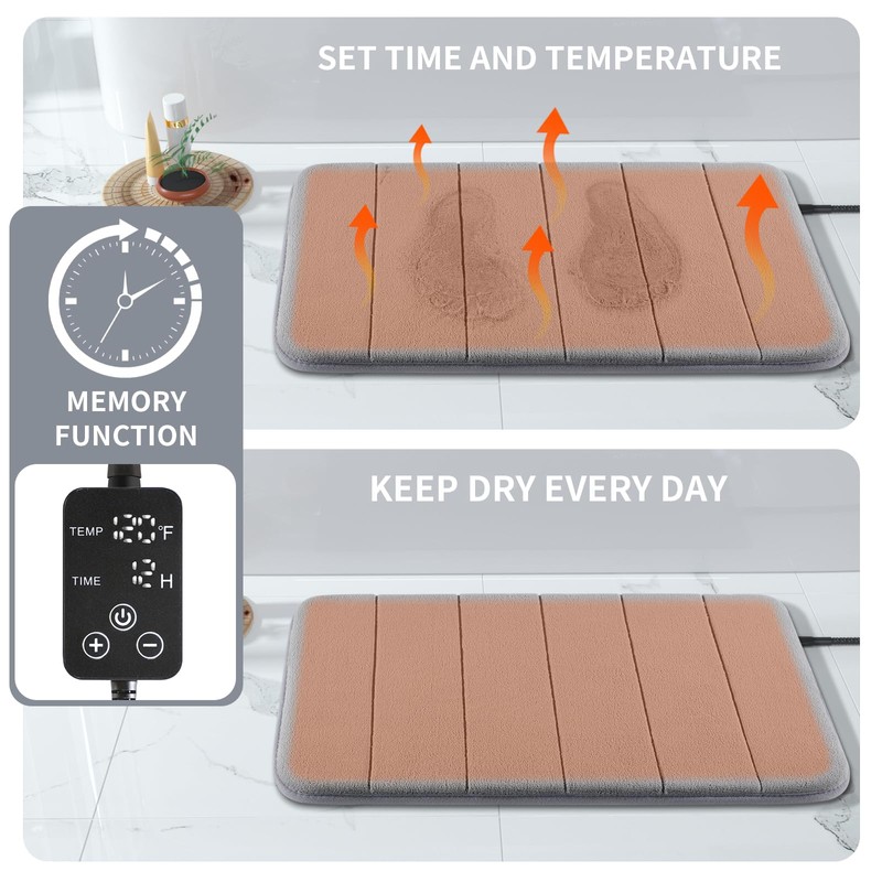 - Customized Settings: Yimobra's heated mat offers adjustable temperatures ranging from 32 to 146 degrees Fahrenheit and time settings from 1 to 24 hours. It also supports continuous operation. We've added a memory function, so once you've set the desired temperature and time, simply turn it on after each shower. This way, you'll have a dry and warm bathroom mat every day, eliminating the discomfort of cold and dampness