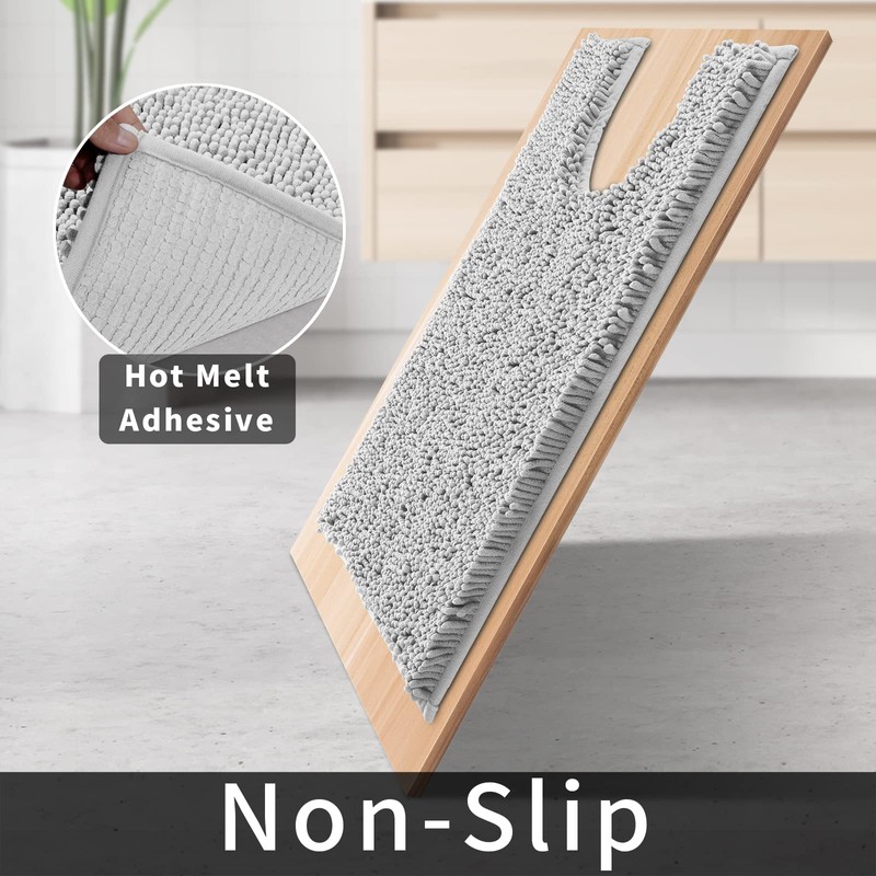 - Anti Slip Backing: Unique design of hot melt adhesive backing on the bottom of the U-shaped toilet rug, and this anti skid rough layer have a good effect on the slippery bathroom. The toilet rug extricate your feet from cold floors while protecting your floor from moisture. As attractive contour bath rugs caring for your family, the non-slip toilet mat is more safer for kids and the elderly