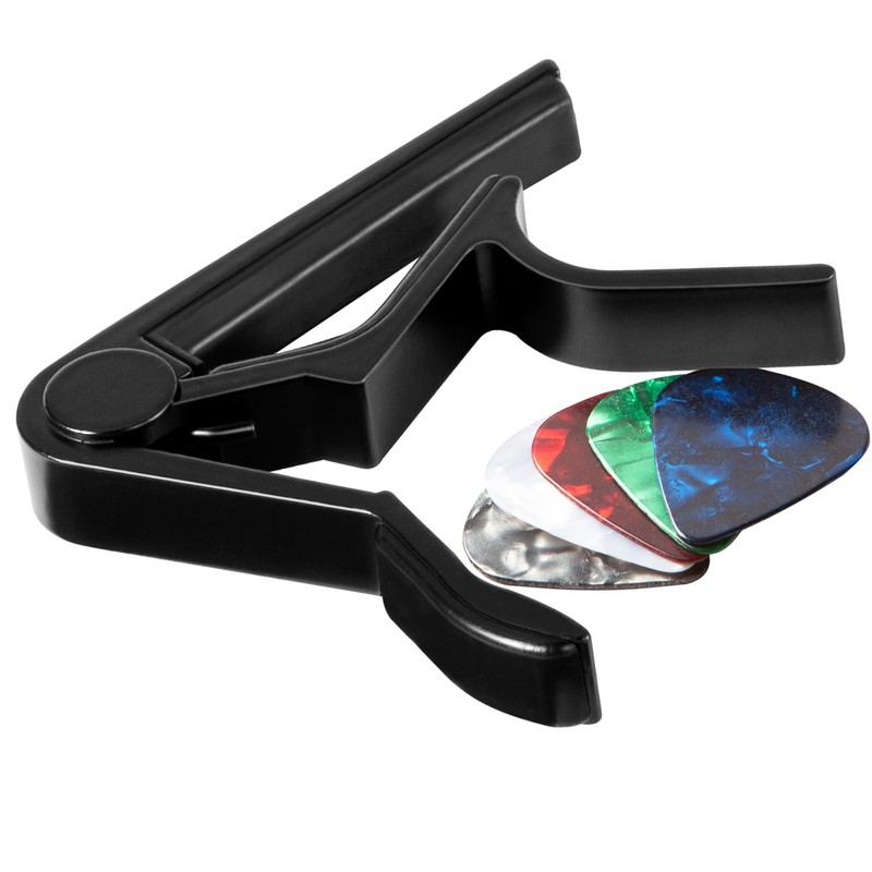 - PRODUCTION STANDARD: Capo for acoustic and electric guitar 6 string,with 5 picks.Super easy to clip on guitar and quick to change.