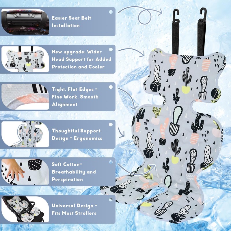 - DESIGN & FABRIC: The new design car seat baby cooling pad features cartoon design that's perfect for boys or girls. It is more tailored to fit car seats or strollers, full coverage of the ice pad in contact with baby's body, enlarged and widened, enlarged for longer lasting cooling, softly conforms to baby's body. The fabric is made of soft cotton, which is cool and breathable. Our stroller cooler pad is a must-have for parents looking for a convenient way to cool hot car seat on a hot summer day