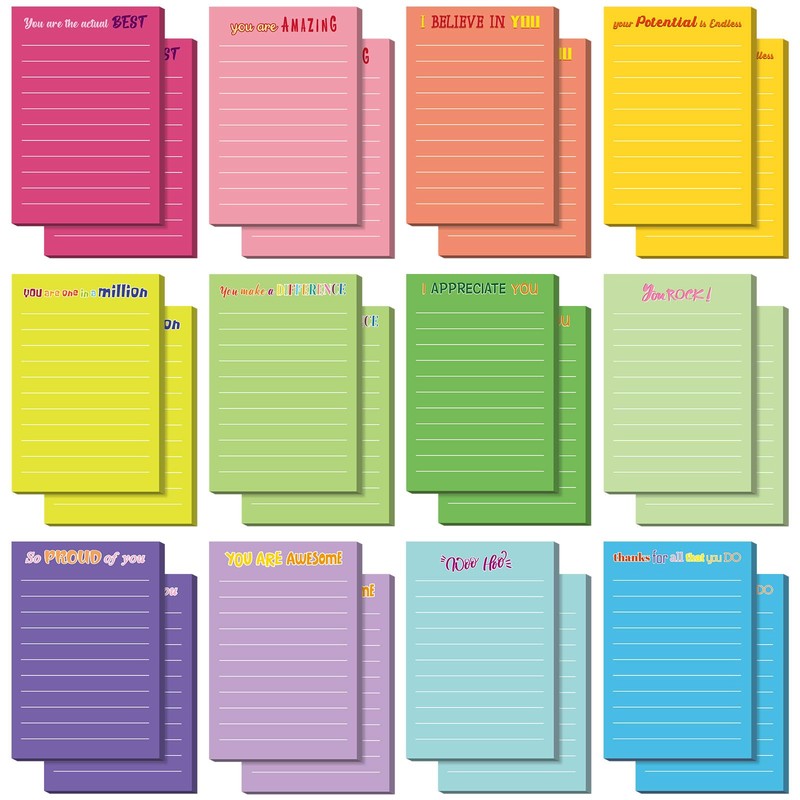 - Sufficient Quantity and Large Size: you will receive 24 pieces of appreciation sticky notes in 12 different colors, and 30 sheets of each; Each notepad measures about 4 x 6 inches, which can provide enough space to write notes; Adequate quantity and various styles will meet your different using needs and replacement needs, you can also share with your family and friends