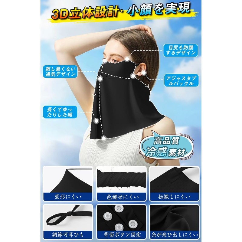 - Covers your face, neck, and ears. 360° Protection Against Accidental Burn: This long type can not only cover the lower half of the face, but also the back of the ears, and nape of the neck. You can rest assured even when you are gardening outdoors, walking your dog, and other situations where you tend to be exposed to sunlight. The soft material feels great on your skin and is lightweight and comfortable to wear, so you can wear it for a long time. The three-dimensional stitching makes your face look smaller. Easy to use even for beginners, this is a must-have item for the seasons when you are concerned about UV rays