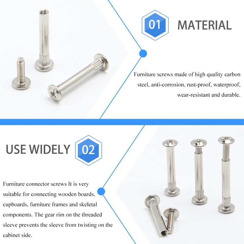 - Use widely: furniture connector screws it is very suitable for connecting wooden boards, cabinets, furniture frames and skeleton components of the sprocket on the thread sleeve prevents the sleeve from twisting on the body side.