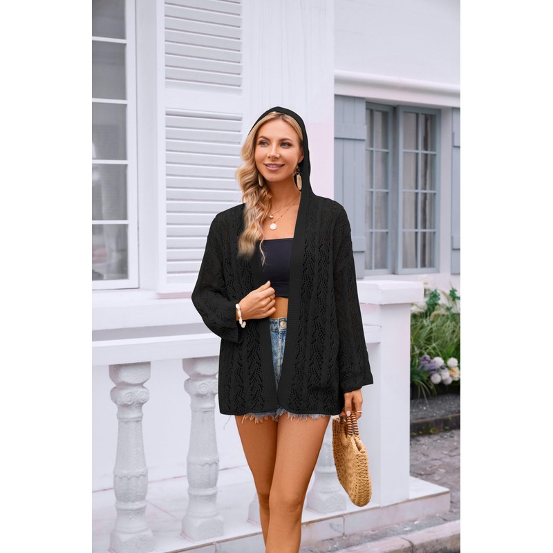 Yingkis Women's Lightweight Crochet Cardigan Sweaters Long Sleeve Open Front Knit Summer Boho Hooded Beach Cover up,Black S
