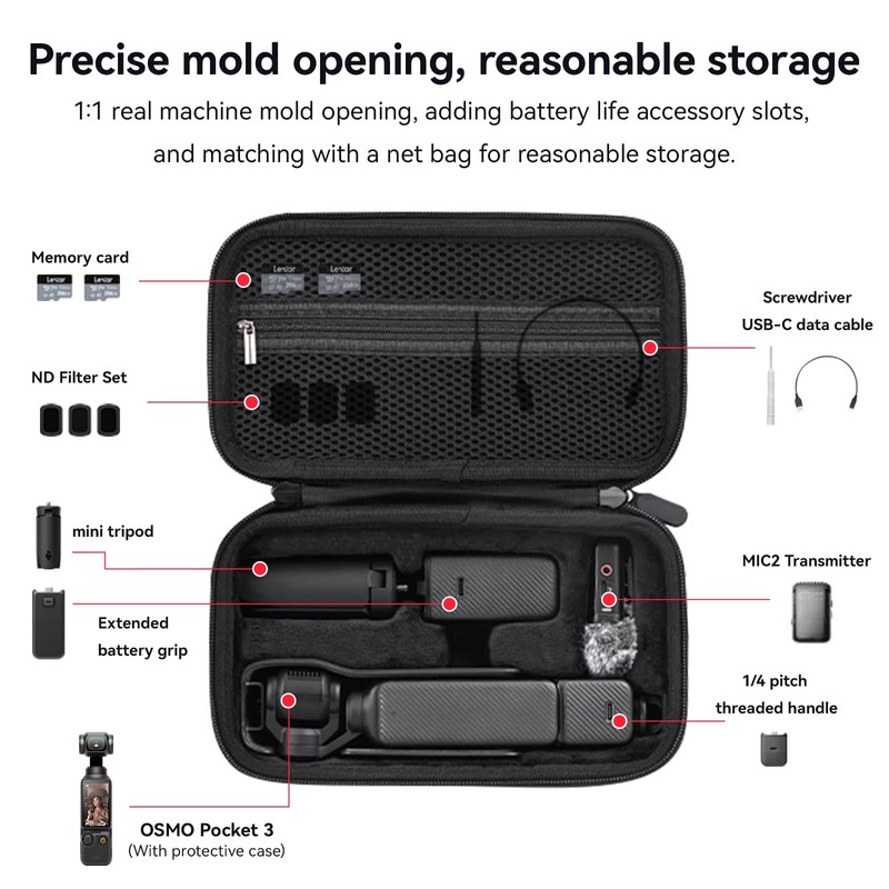 - 🔹 Precision Fit for DJI Pocket 3 Creator Combo - Exact-Molded Interior securely cradles your Osmo Pocket 3 camera (with thumb control attached) + all Creator Combo accessories: battery handle, wide-angle lens, mini tripod & DJI mic adapter. Zero wasted space – No shifting or scratches during travel!