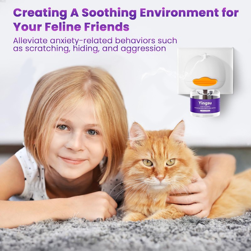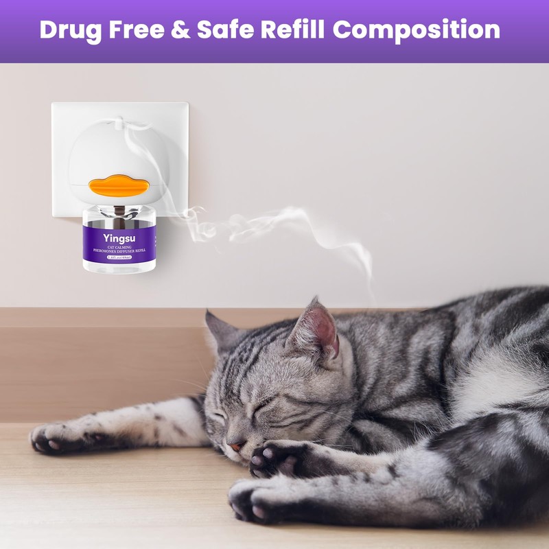 - Effectively Alleviate Anxiety: Yingsu Cat Diffuser Calming Multicat includes 2 diffusers and 4 refills (48ml each). It utilizes synthetic pheromones, that mimic the natural calming scents produced by cats, creating a soothing environment that effectively reduced anxiety and stress in your feline friends.Ideal for multi-cat households, it encourages harmony among your cats