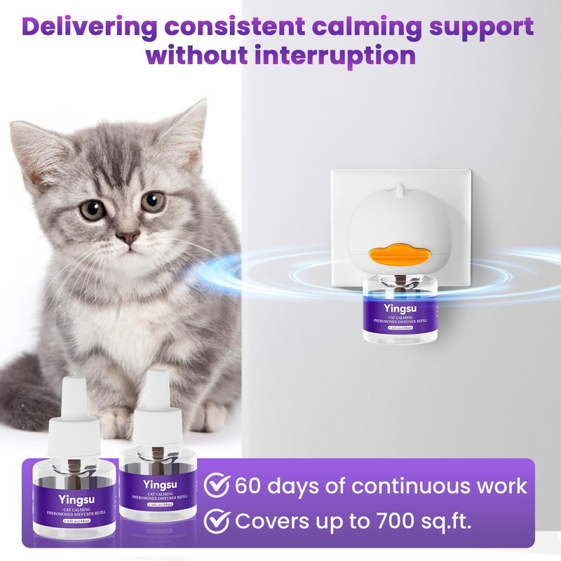 - Long-lasting Effects: Yingsu cat calming covers up to 700 square feet, ensuring broad effectiveness. Each refill lasts up to 30 days, delivering consistent calming support without interruption. That helps alleviate anxiety-related behaviors such as scratching, hiding, and aggression, making it an essential addition to your home