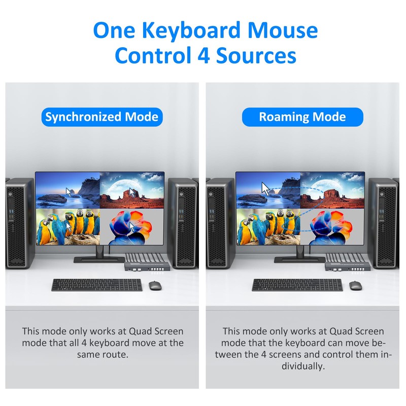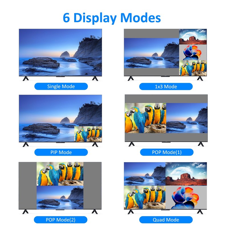 - 【Works as 4x1 Multiviewer】This Quad KVM Switcher can allow 1 monitor displaying 4 sources simutaneously or individually, with 6 Display Modes:Single mode, 1x3 mode, PIP mode, POP mode(1), POP mode(2) and Quad mode