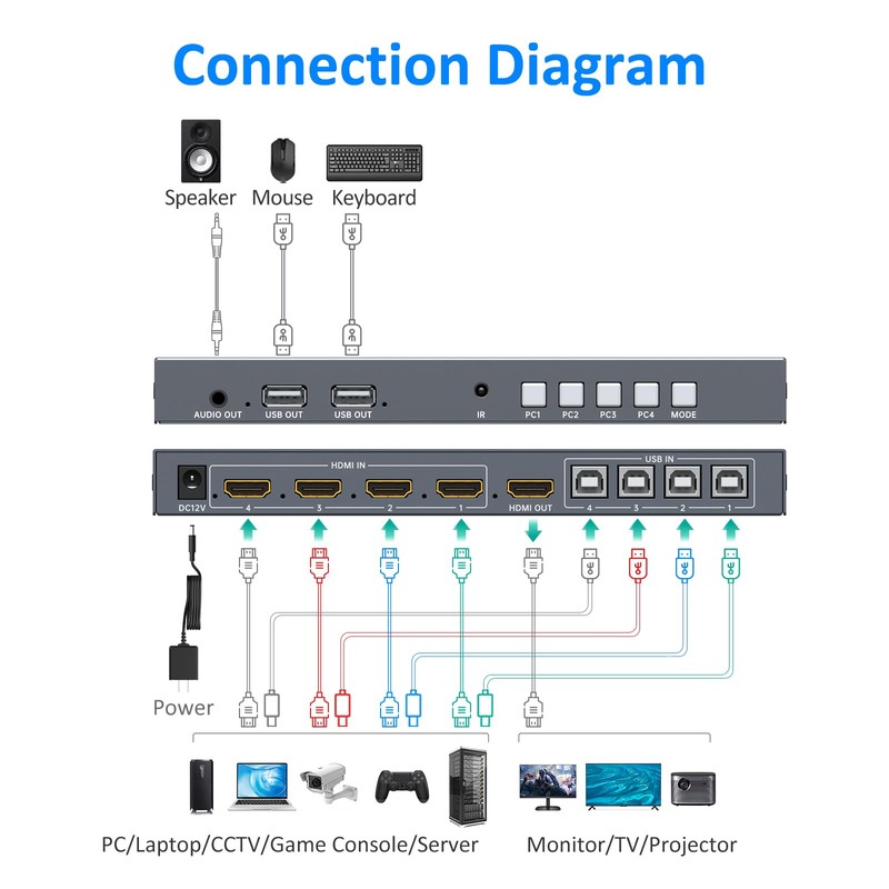 - 【Works as 4 in 1 Out KVM Switch】 Yinker 4 Port HDMI KVM with Multi-viewer supports 1 set of HD Monitor Keyboard Mouse controls and switch 4 HDMI sources (computers, laptops,game console, CCTV, etc). A 3.5mm audio port is built for individual audio output.
