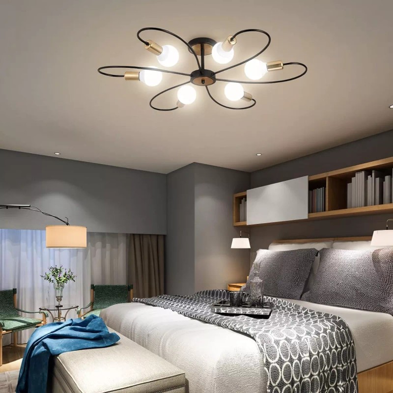 Elegante y moderna: esta lámpara de techo semiempotrada está rodeada por 6 postes de luz y bombillas de hierro negro mate que parecen flores que florecen en el techo. Emite un brillo acogedor y crea una sensación cómoda. Estilo moderno y vintage combinado, se puede combinar con cualquier estilo de decoración del hogar.