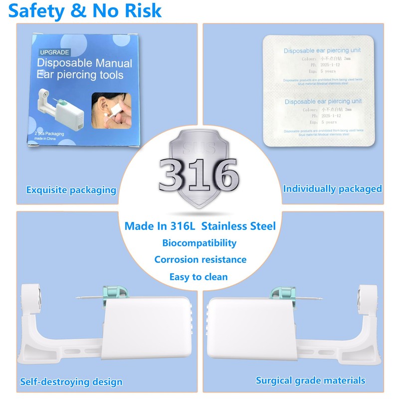 - Safety&No Risk:Each ear piercing gun is individually packaged according to standard medical requirements,with a self-destroying design that ensures safe,sterile piercing every time.So you can be used safely without the risk of infection or allergy.