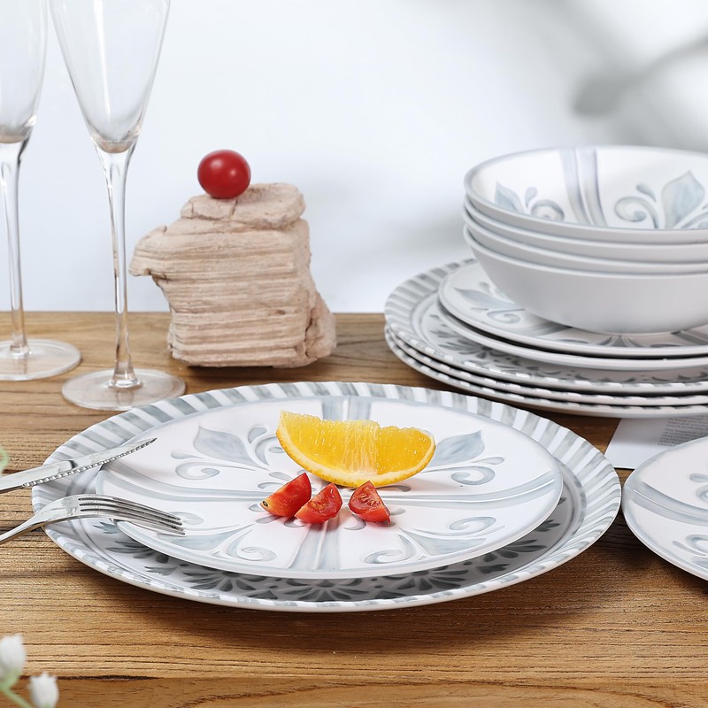 - The melamine dishes set is designed in relief, with a convex and concave texture, with each plate and bowl possessing different characteristics, this embossed dinner set will become the highlight of the table.