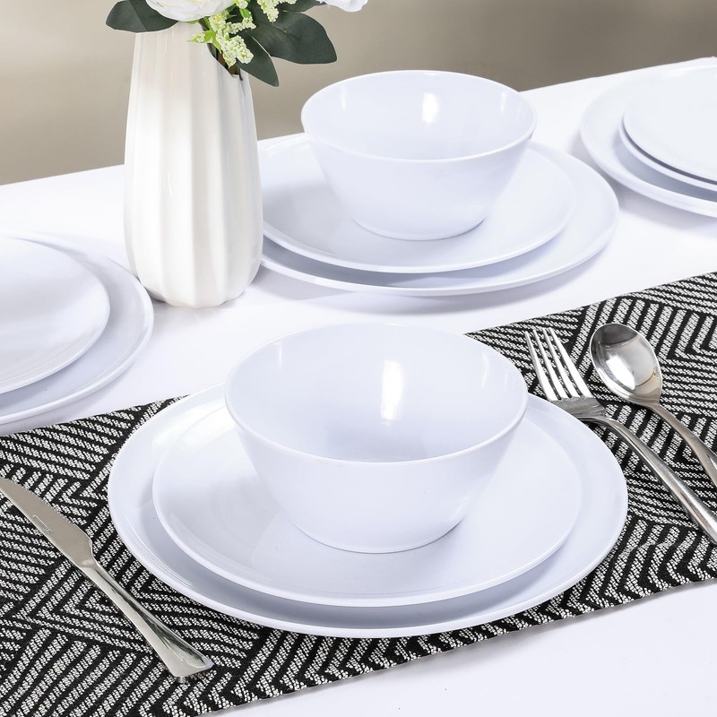 - 18pcs melamine dinnerware set included 6pcs 10.75" dinner plates, 6pcs 8.5 salad plates, 6pcs soup bowls, service for 6.