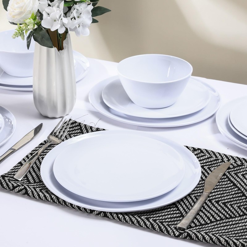 Yinshine Melamine Dinnerware Sets - 18pcs Melamine Plates and Bowls Set for Indoor Outdoor Use, Dishes Set for 6, Dishwasher Safe, White