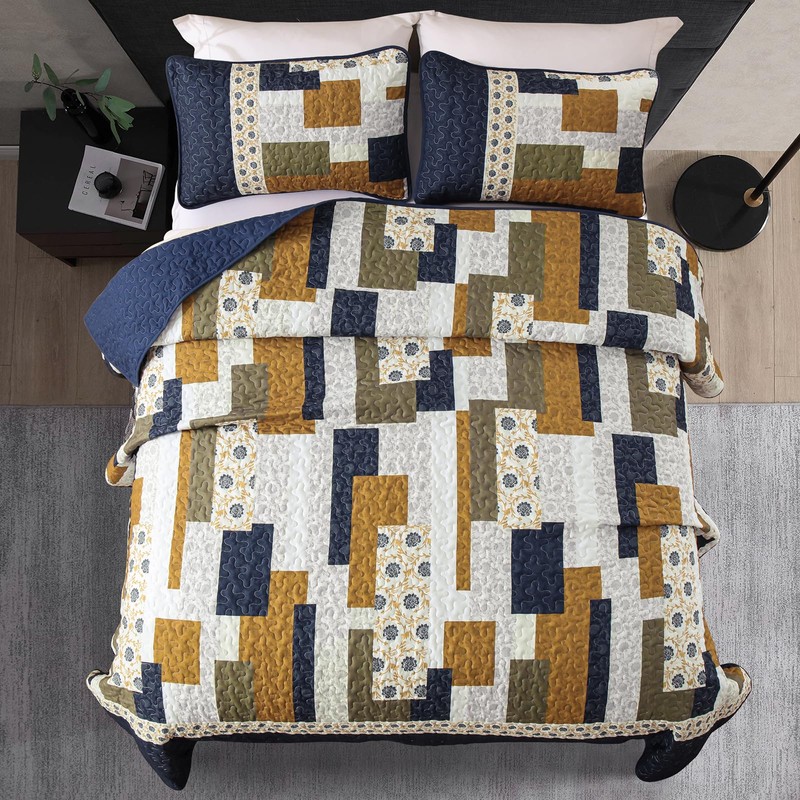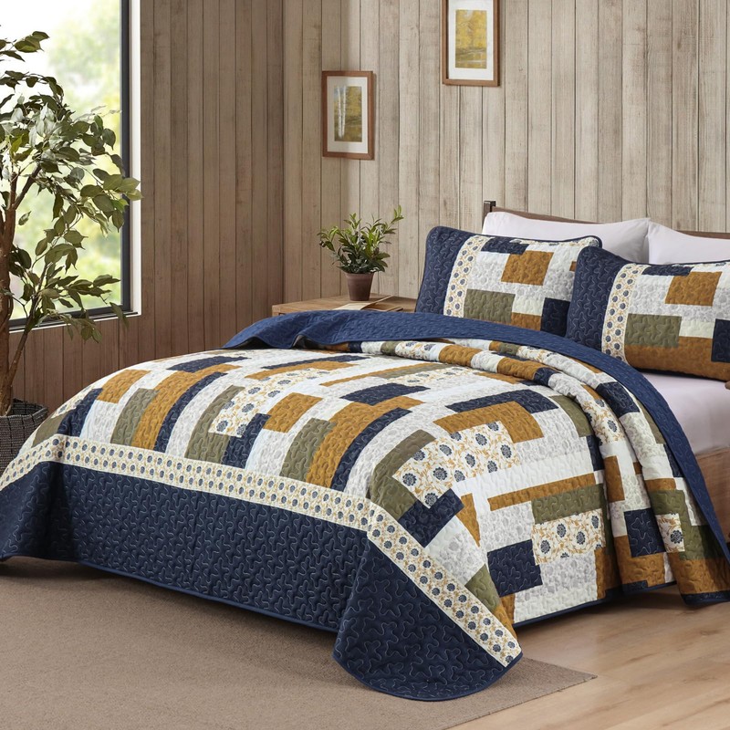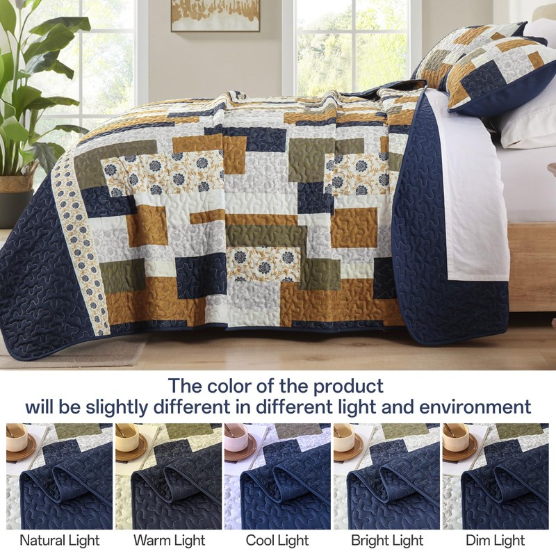 Yiran Patchwork Quilts Queen Size, Lightweight Navy Boho Bedspreads Bedding Set, Farmhouse Coverlet Set with 2 Shams for All Seasons, Navy Yellow