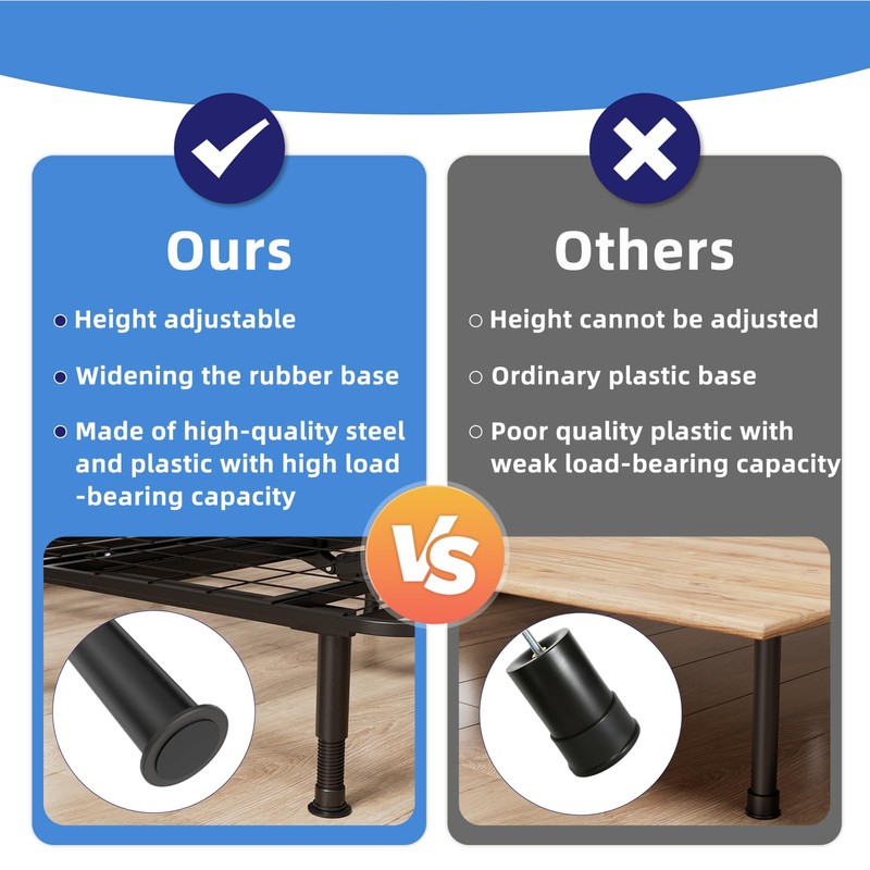 - The bed legs feature a heavy-duty steel frame coated in rust-proof material, a high-quality plastic inner core, and anti-slip rubber pads. This robust design supports up to 600 pounds.