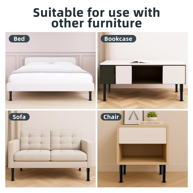 - Versatile Use: Our 4-pack adjustable furniture legs are suitable for cabinets, sofas, TV stands, nightstands, beds, tables, chairs, closets, dressers, bookshelves, coffee tables, and bookcases—or any other furniture needing height adjustment.