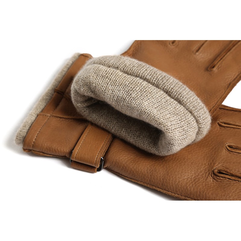 YISEVEN Men's Deerskin Leather Gloves with Classical Belt Button Real Natural Hand Warm Cashmere Lined Heated Lining Winter Dress Driving Motorcycle Work Luxury New Year Gift, Camel 8.5"/Small