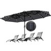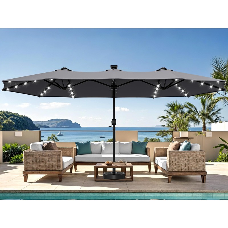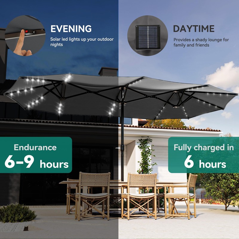 - Solar-Powered 15ft Dual Canopy: This umbrella integrates 48 solar LEDs across 12 ribs, delivering 6-8hrs illumination after sunlight charging. Its 15ft span shelters furniture and family gatherings, blending sun protection with evening ambiance for seamless outdoor enjoyment