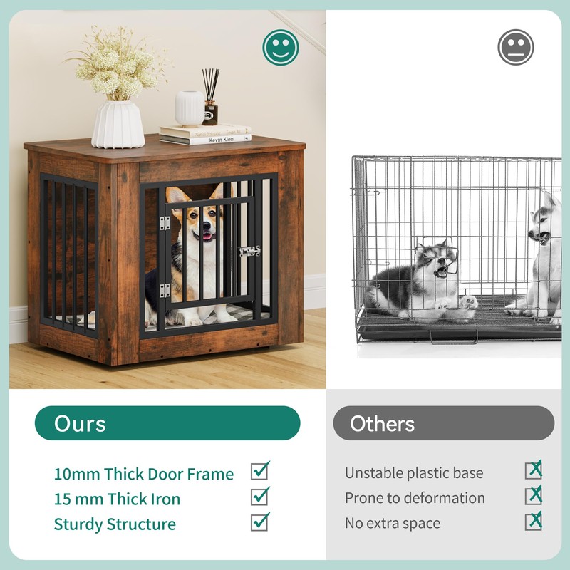 - Iron-Wood Fusion: The large dog crate combines a 15mm square tube and 15mm chipboard for added solidity and durability; This fusion promotes both strength and aesthetic appeal; The rustic brown finish blends well with any home decor, making it a versatile addition to your living space