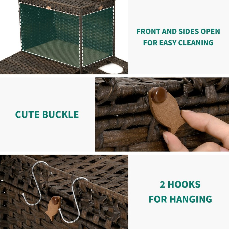 - Cat Friendly Litter Box Cabinet - The top of the handwoven rattan cat house is equipped with support bars, not easy to deform and collapse, suitable for cats of all sizes to play and snooze on it. Comes with two hooks to hang the litter scoop and side cat door for easy cat access.