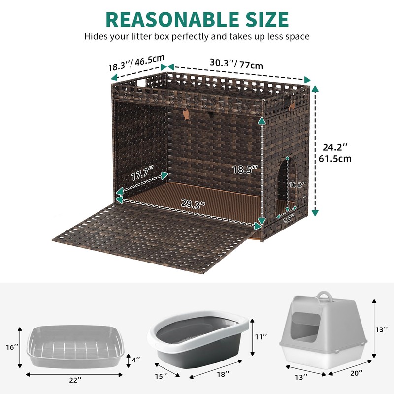 - Spacious Litter Box Furniture - The interior dimensions of the cat litter box furniture are 17.7" x 29.3" x 18.5" and fit most cat litter box. Topped with a 2-inch tall rattan fence to keep the pet bed from falling. The modern hidden cat litter box fits a variety of furniture styles.