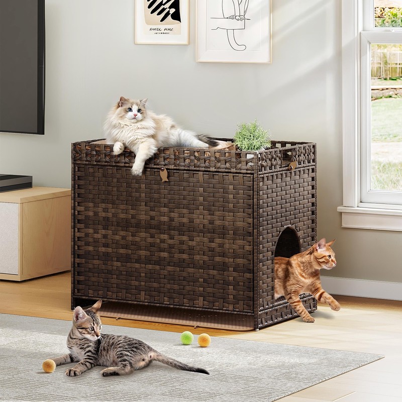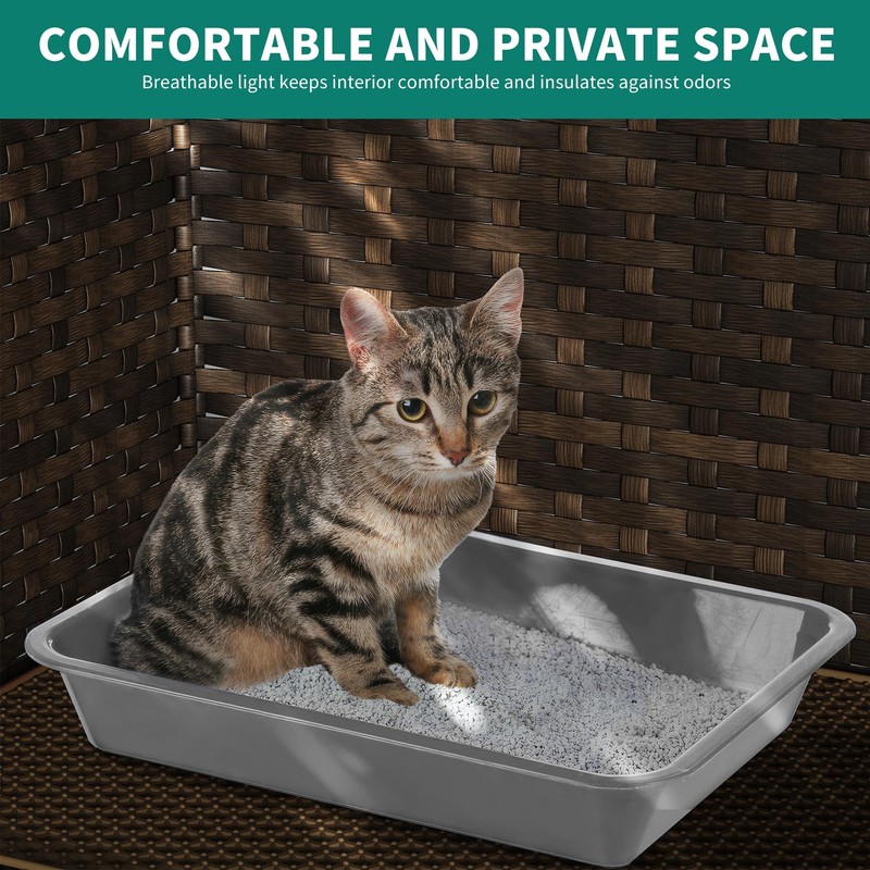 - Odor-Free and Comfortable - Decorative cat litter box Furniture provides a private, reassuring space for cats. The rattan litter box enclosure has a light filtering feature that allows cats to enjoy the sun while blocking out odors.
