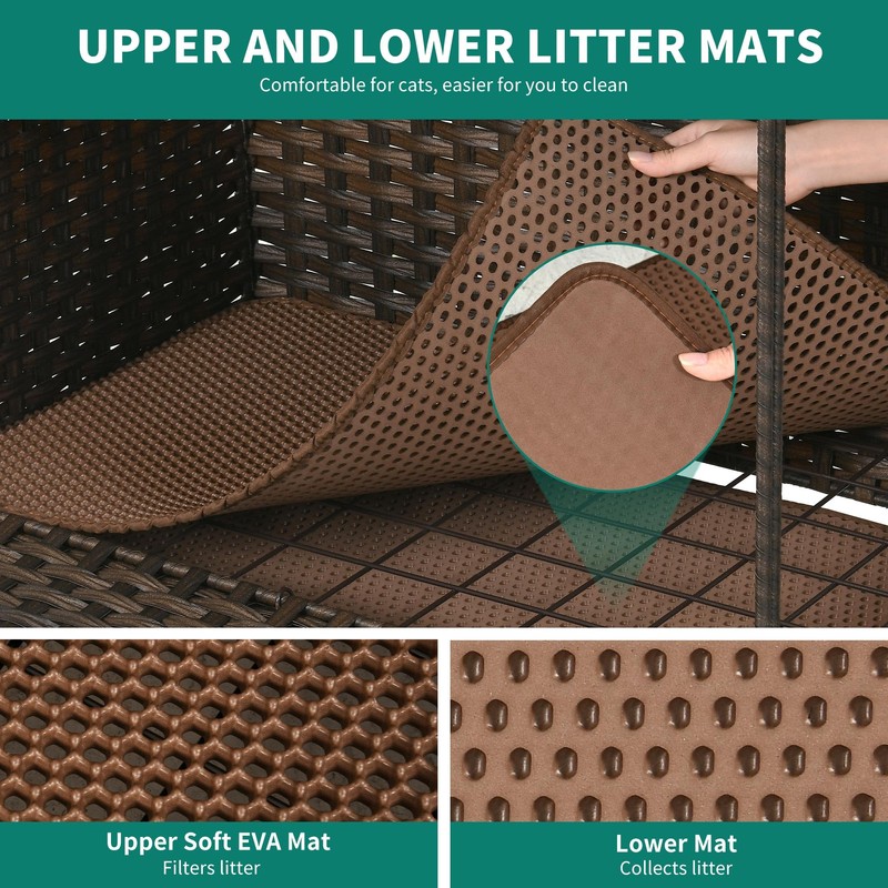 - Cat Attentive Care - YITAHOME Cat Washroom Furniture comes with a soft litter mat so your cat can walk comfortably. The large holes in the litter mat filter loose litter to the bottom mat, and you can gently pull out the bottom mat to dump the litter, eliminating the hassle of daily cleaning.