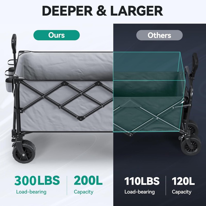 - Enhanced Capacity & Strength: Boasting an upgraded frame and larger wheels, our collapsible wagon offers a large 200-liter capacity and 300 lbs weight limit; The handy mesh cover ensures all your camping essentials are transported with ease
